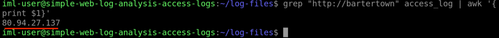 Solution: 80.91.27.137. Command I used to find the IP is grep ‘http://bartertown’ access_log | awk ‘{print $1}’